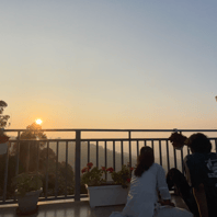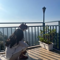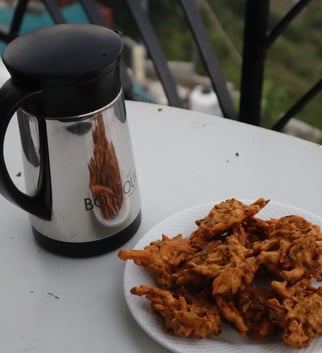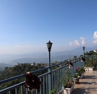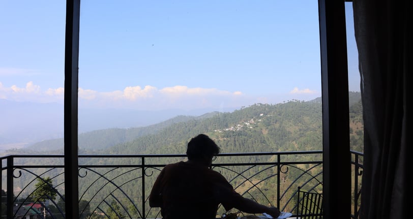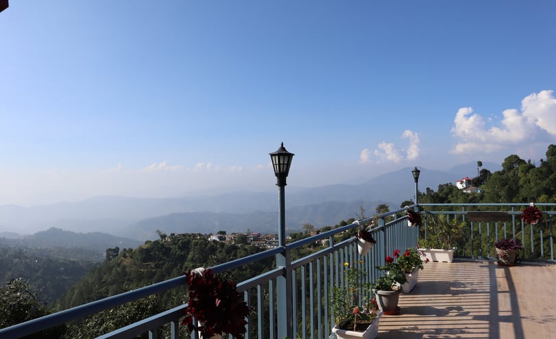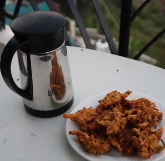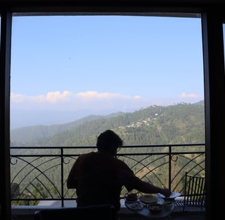Upon arriving, we checked into "Himalayan Voyage" that offered panoramic views of the surrounding hills and Himalayan range. Unfortunately, when we arrived, it was super cloudy and we could not see the Himalayas. The warm hospitality of the hosts made us feel at home. After settling in, we were debating on whether to take some rest while sipping tea and enjoying the mesmerizing view or to head out. As soon as we took a big stretch on the bed, we instantly agreed to enjoy the day staying in. We ordered some tea with veg pakora and just sat on the balcony watching birds fly and clouds move in a never ending open sky.